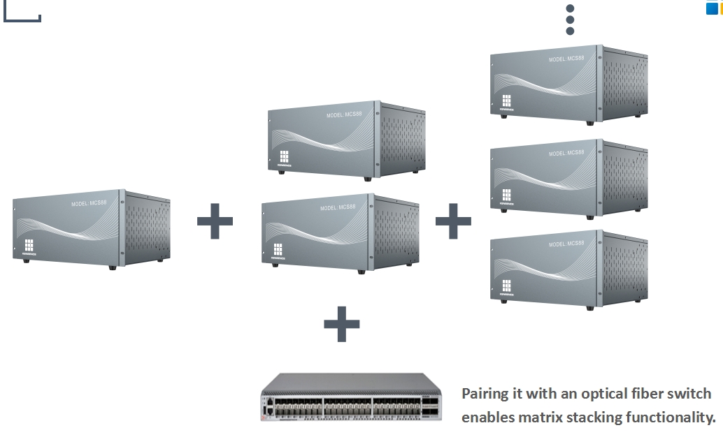 The MCS-ANY-16 is Kensence's latest stackable and visualizable high-definition matrix, designed to revolutionize large-scale audio and video signal transmission, processing, and sharing. Featuring a modular, asymmetric design, this cutting-edge matrix supports rapid, seamless switching and delivers a maximum resolution of 4K@30Hz. Its stackable architecture allows multiple matrices to be interconnected via fiber optic or network connections, enabling easy expansion to meet the demands of large-scale, cross-regional applications.