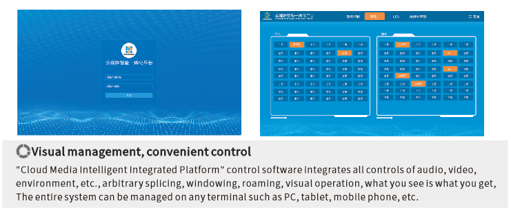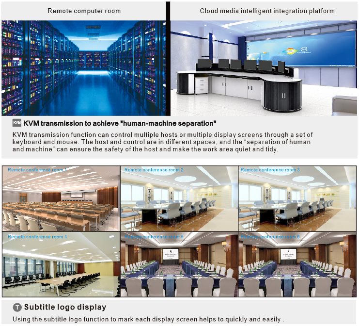 The cloud media intelligent integration platform adopts the popular HDBT technology, which is transmitted by the network and will be dispersed in various computer rooms.KVM nodes are combined to use a set of keyboard and mouse to quickly switch and manage remote computers with convenient and fast mobile visualization.