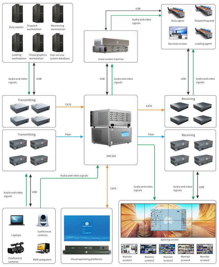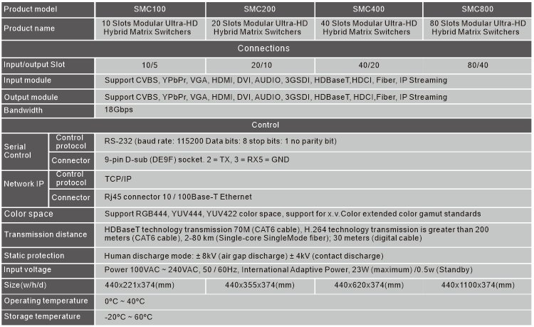 The SMC series is a powerful and flexible 4K ultra HD hybrid matrix. It is designed with high-performance hardware and integrates audio, video and control. It perfectly supports all kinds of audio and video signal switching processing, such as HDMI/DVI/HDCI/HDBaseT. /Fiber/3GSDI/IP/VGA/CVBS/YpBpr and AUDIO signals, support 4K@60Hz resolution input and output, combined with large screen splicing,seamless switching, seamless backup, smart board monitoring, KVM transmission and other functions,products Widely used in multimedia conference rooms, command and control centers, smart cities, radio and television, traffic management centers and other fields.