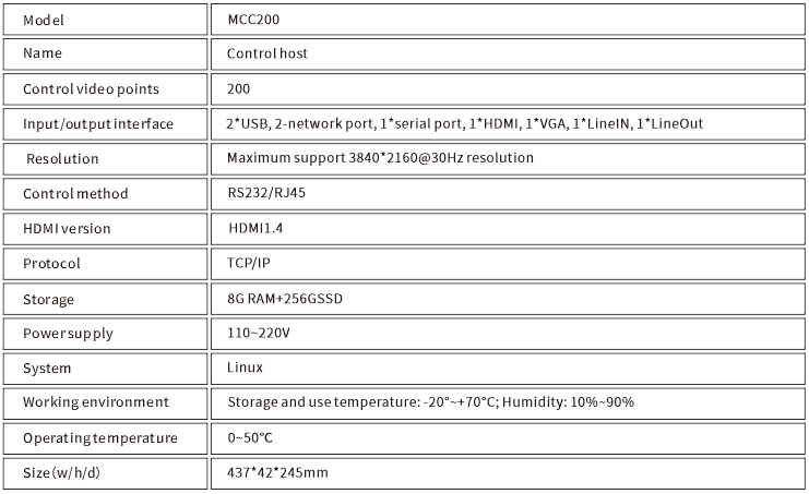 The MCC200 control host is a customized Linux system that supports "cloud media intelligent integrated platform", "cloud media interactive splicing system",The installation and use of control software such as "Intelligent Conference Reservation System Platform" and "WEB Programmable Central Control Platform" are arranged at any node of the network for use in the systemFor control and switching, the control host supports computer control, wireless PAD control, and the third-party central control device connection control. Do more from the designProfessional features such as access, stability, and professionalism.