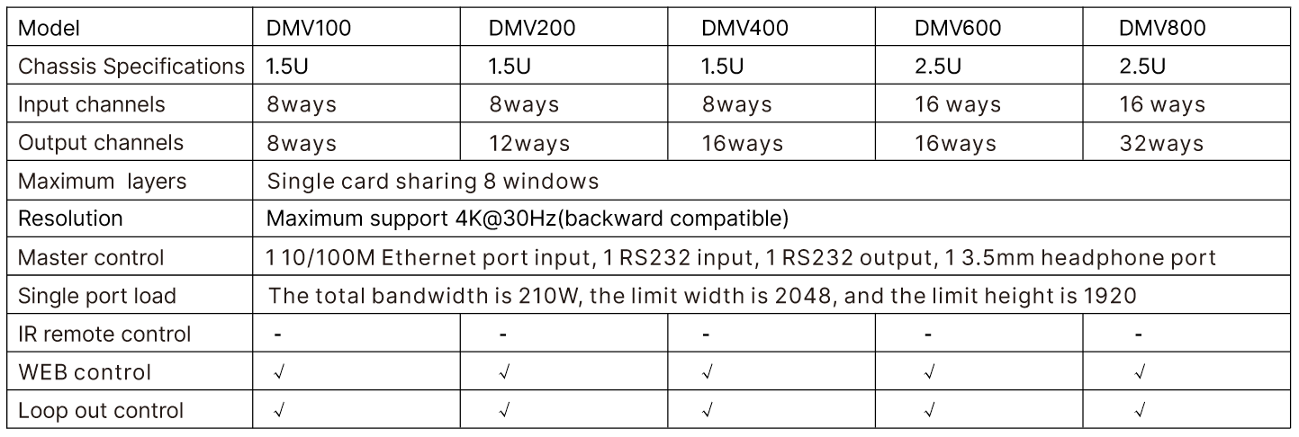 The DMV series multi-screen splicing processor adopts a 19-inch standard chassis design, a variety of specifications and models are available, and can be flexibly configured according to needs. The whole machine can realize splicing combined display within 32 display screens at most, which can meet the needs of most splicing display projects. It can be widely used in security monitoring, exhibition display, military command, video conference, commercial display, government announcement and other industries.