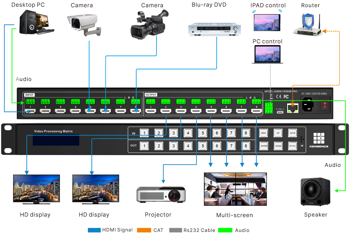 The Seamless 4x4 and 8X8 HDMI Matrix Switch supports the highest resolution of 4K@30Hz, along with support for 3D video, HDCP 1.4 specification, and 16-bit color depth. The matrix specifications are KX-HD0404S and KX-HD0808S, providing customers with a lossless frame and delay-free ultra-clear full digital experience. It offers a variety of control interfaces (RS232/TCP/IP) to meet customer control needs.